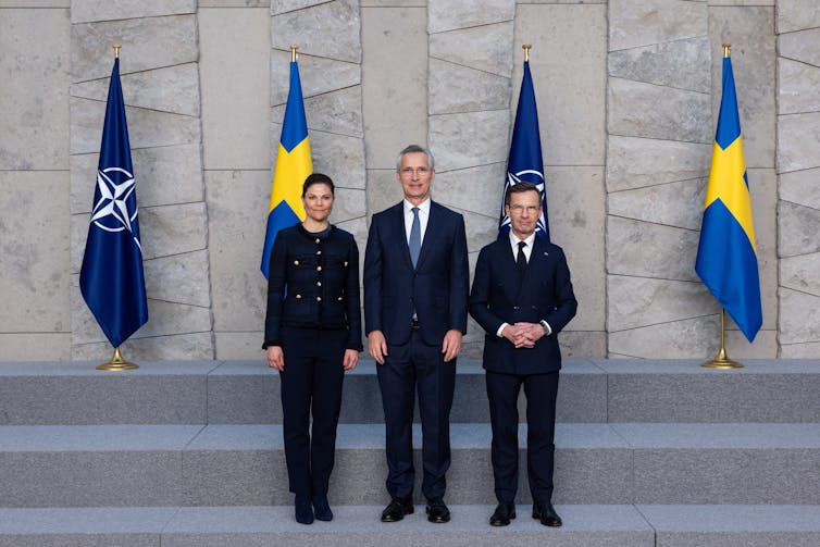 La princesa heredera de Suecia, Victoria, con el secretario general de la OTAN, Jens Stoltenberg, y Ulf Kristersson, primer ministro de Suecia.