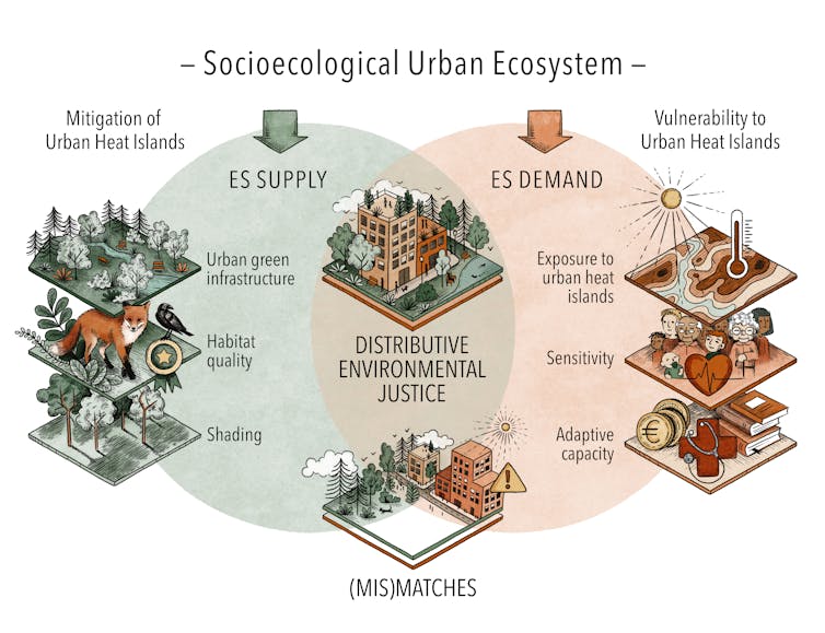 Marco conceptual sobre el suministro y la demanda de la regulación de la temperatura urbana y los desequilibrios espaciales. El suministro de regulación de la temperatura urbana se evalúa en función de los atributos ecológicos de la infraestructura verde y la demanda de regulación de la temperatura urbana se basa en evaluaciones de vulnerabilidad al calor urbano. Los desequilibrios espaciales entre la oferta y la demanda de regulación de la temperatura urbana subrayan su importancia para la justicia ambiental (distributiva).