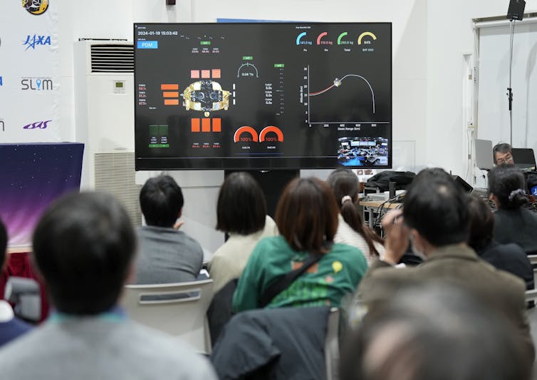 Datos de la misión SLIM proyectados en el Campus Sagamihara de JAXA durante el aterrizaje de la nave.
