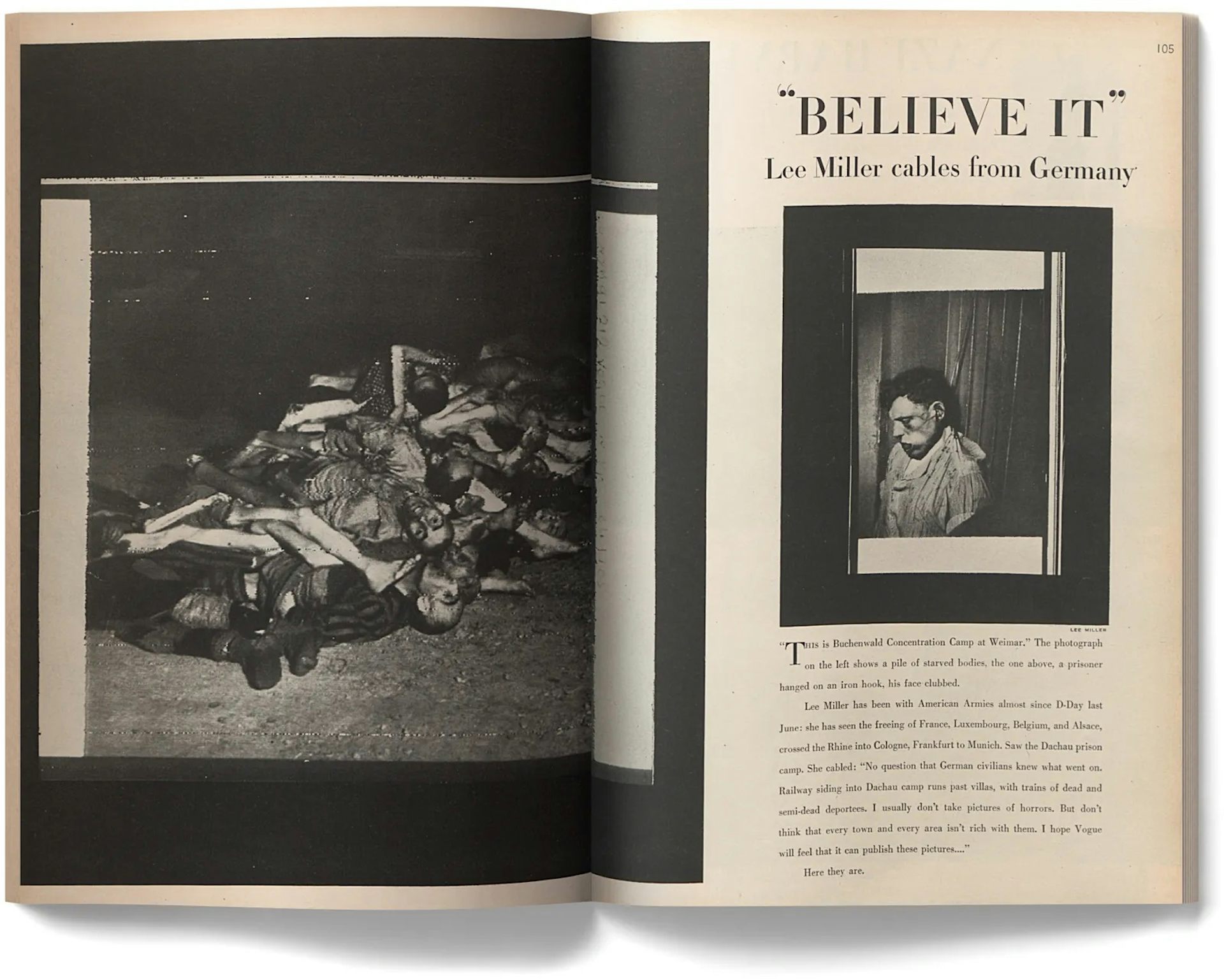 Las imágenes fueron publicadas en las ediciones británica y americana de Vogue, junto a fotos de moda y anuncios de maquillaje. El titular que acompañaba su historia sobre los campos de concentración –aparecido en el especial “Victoria” en junio de 1945– rezaba: “BELIEVE IT” (“CRÉELO”). Las fotos funcionaban, pues, como testimonio, como prueba para una población escéptica.