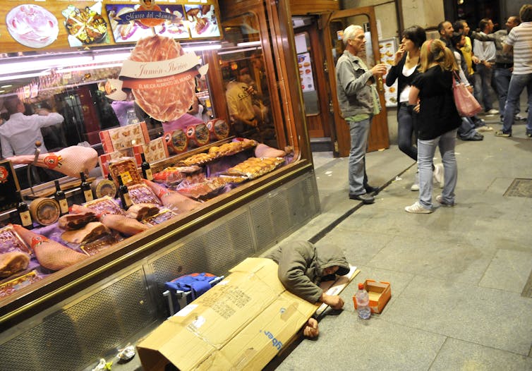 Una persona sin hogar frente a un bar en el centro de Madrid.