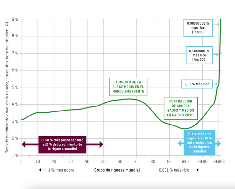 El gráfico se basa en la riqueza y no en la renta, uno de los debates que abandera Oxfam junto al World Inequality Database de Thomas Piketty, Gabriel Zucman y sus colegas, y señala la intensidad de la concentración de la renta, apuntando especialmente a los privilegios fiscales y a los mecanismos para evadir impuestos.
