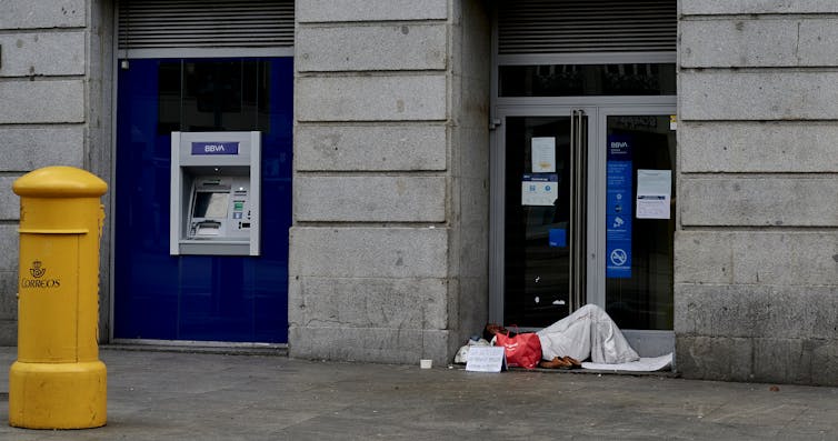 Una persona en situación de calle durante el estado de alarma en abril de 2020 en Madrid.